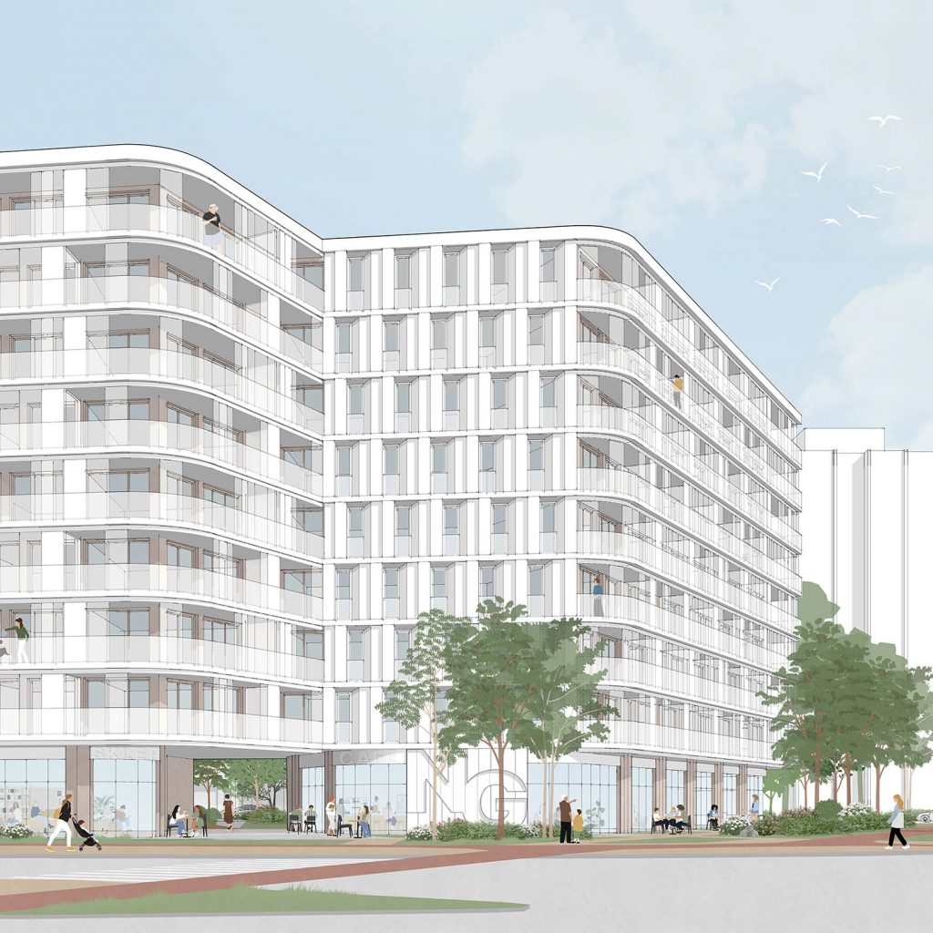 Projekt będzie stanowił dodatkową izolację akustyczną od dróg dla zabudowy położonej w głębi kwartału zabudowy. Nowoczesne rozwiązania akustyczne, okna, podwójna elewacja zapewni komfort naszym mieszkańcom. Dzięki podziemnym garażom oraz odpowiedniej ilość miejsc parkowanie nie rozleje się na sąsiednie ulice, co jest częstym problemem przy zabudowie biurowej. Miejsca dla usług również przewidziane w garażu podziemnym. Nowe nasadzenia zieleni wysokiej oraz teren rekreacyjny, ogólnodostępny plac zabaw zapewni wytchnienie – inwestycja poprawi jakość przestrzeni i komfort życia mieszkańców. Przejście bramne – skróci drogę do przystanków autobusowych, a wyremontowana ulica poprawi bezpieczeństwo.
