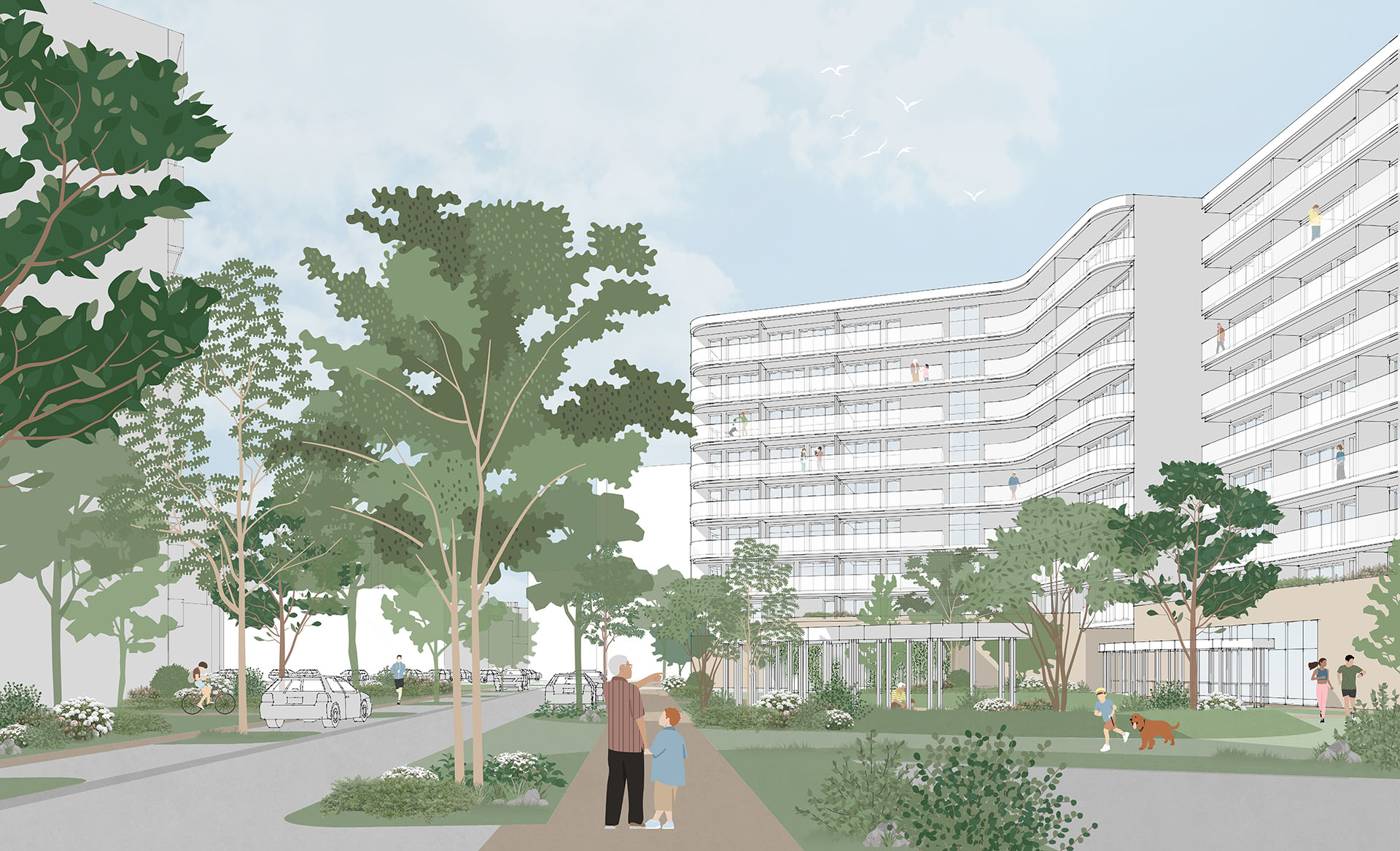 Chcemy stworzyć przyjazną, kameralną i zieloną inwestycję: z wygodnymi chodnikami i ścieżkami rowerowymi, uporządkowanym ruchem samochodowym, ciekawą ofertą usług w parterach budynków, zadbaną zielenią oraz przestrzeniami do spotkań sąsiedzkich.