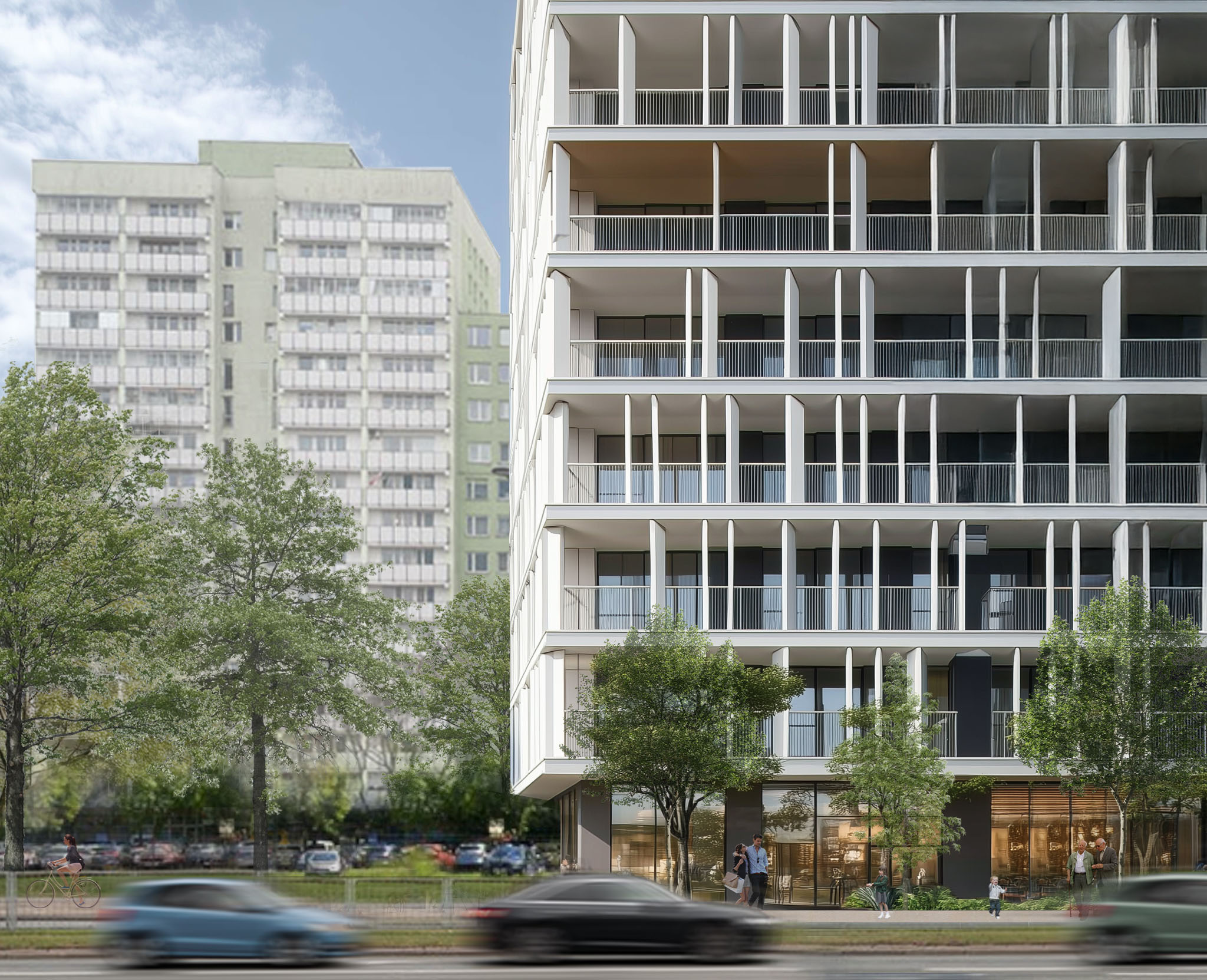 - Priorytet dla pieszych i rowerzystów – parkingi podziemne, zadaszone miejsca rowerowe (również dla cargo), przejście bramne do Al. Stanów Zjednoczonych