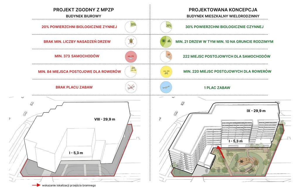 Nie, dla terenu inwestycji został uchwalony w 2014 r. plan miejscowy przewidujący funkcję handlowo-biurową z wysokością zabudowy 30m, powierzchnią zabudowy 70% i intensywnością zabudowy 5,0 – oraz brakiem połączeń między dziedzińcem a skrzyżowaniem. Proponowana inwestycja ma znacząco lepsze parametry.